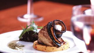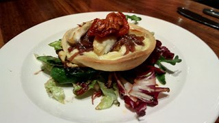 Mushroom, goats cheese and Heather ale strudel. - Mushroom, rosemary, Bonnet goats cheese from Ayrshire and Heather Ale, baked and wrapped in filo pastry. Served with polenta chips and shallot sauce.