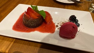 Chocolate cake with plum and port compote. - Coulant chocolate cake served warm with port soaked plum compote and beetroot coconut and whisky ice cream. V