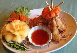 A mixed starter Consists of chicken spring roll, prawns spring rolls, minced chicken and prawns on toast, chicken satay, Thai fish cakes, vegetable golden parcels and crispy rice vermicelli accompanied with a variety of sauces (peanut sauce N, sweet chilli sauce, carrot and cucumber pickle and sweet.)